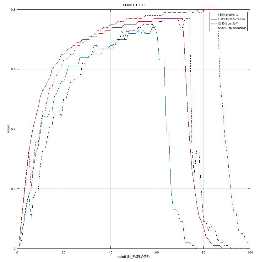 Changing the order of magnitude of LENGTH can possibly change quite a bit the shape of the results. However, a common behaviour emerges, similar to what the above pictures show: with increasing N_EXPLORE, the score increases, then shows a plateau ; then when further increasing N_EXPLORE, the score abruptly falls down to zero.